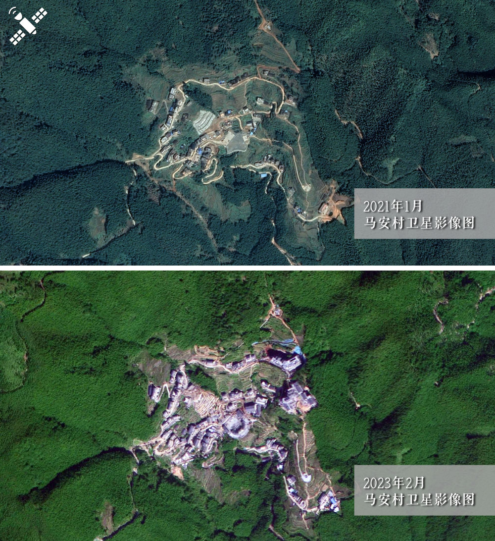 解讀:2021年1月村落原貌(上圖)對比2023年2月新貌(下圖),馬安村文旅建筑群規(guī)模顯現(xiàn)。
