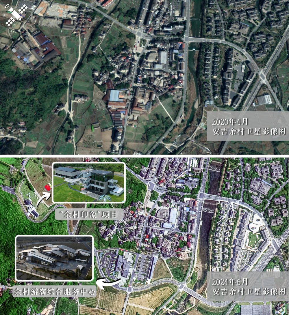 解讀:2020年4月原貌(上圖)對比2024年6月新貌(下圖),安吉余村將廢棄廠房改造為“余村印象”項目,并建成余村游客綜合服務中心。