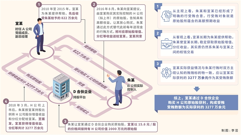 其中,2010年至2015年,宣某為B公司原料供應(yīng)業(yè)務(wù)提供幫助,先后11次收受B公司實(shí)際控制人朱某給予的100萬美元、20萬歐元,折合共計(jì)822萬余元。2016年8月,朱某向宣某提議,由宣某購買其實(shí)際控制的H公司(擬上市)的原始股,告知其公司上市后原始股將有3到5倍增值,并有高額分紅,讓其放心購買。朱某擬通過此方式將對應(yīng)原始股增值、分紅等收益送給宣某,替代此前每年送現(xiàn)金的行賄方式,宣某表示同意。朱某安排成立了D合伙企業(yè)作為持股平臺,讓宣某等多名國家工作人員(另案處理)通過D合伙企業(yè)購買原始股。宣某以15.6元/股的價(jià)格,通過D合伙企業(yè)間接持有H公司價(jià)值2000萬元的原始股。2018年3月,H公司上市后,D合伙企業(yè)陸續(xù)減持H公司的股份,朱某將增值收益、H公司分紅按宣某持股比例分配給宣某。至案發(fā)時(shí),股份已陸續(xù)全部售出,扣除本金后,宣某獲得增值、分紅等收益共計(jì)3277萬余元。