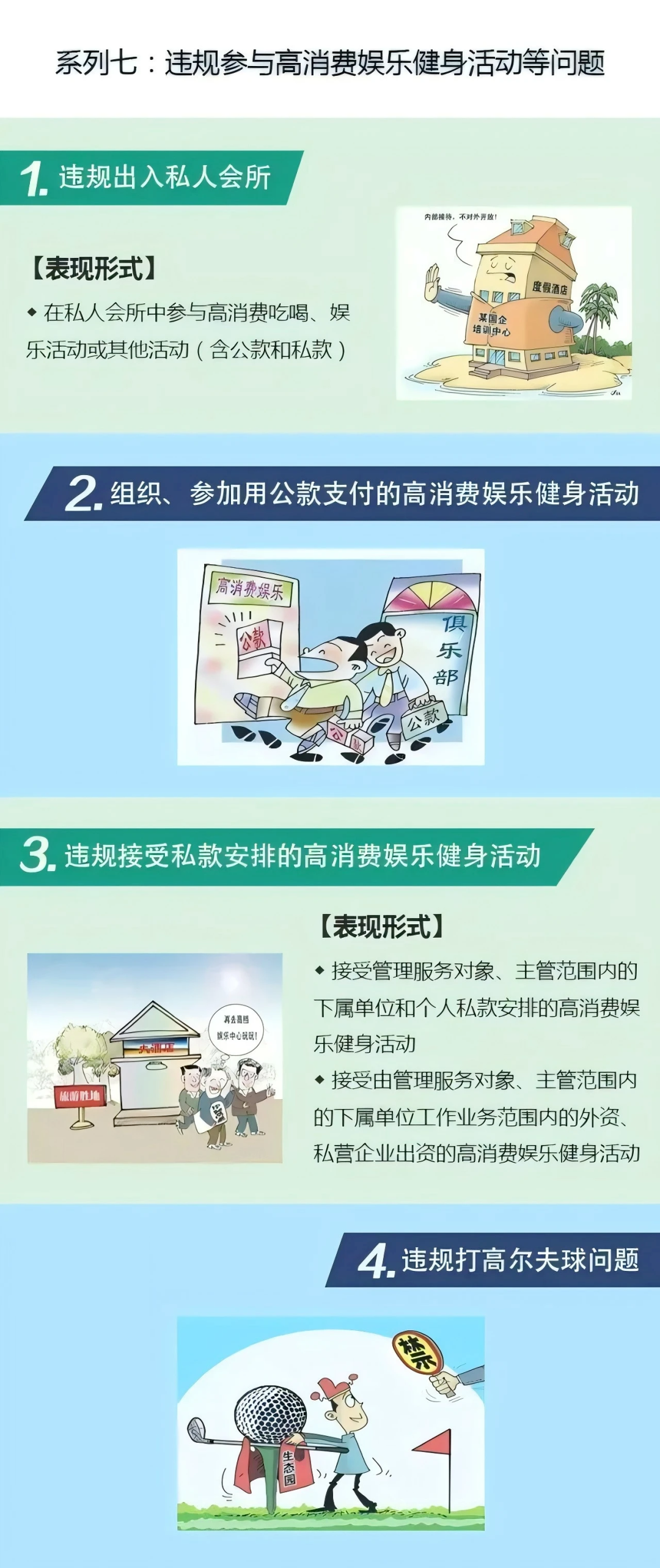 6.其他(包括6種表現(xiàn):違規(guī)配備和使用公車、樓堂館所問題、提供或接受超標準接待、組織或參加用公款支付的高消費娛樂健身等活動、接受或提供可能影響公正執(zhí)行公務的健身娛樂等活動、違規(guī)出入私人會所、領導干部住房違規(guī))。