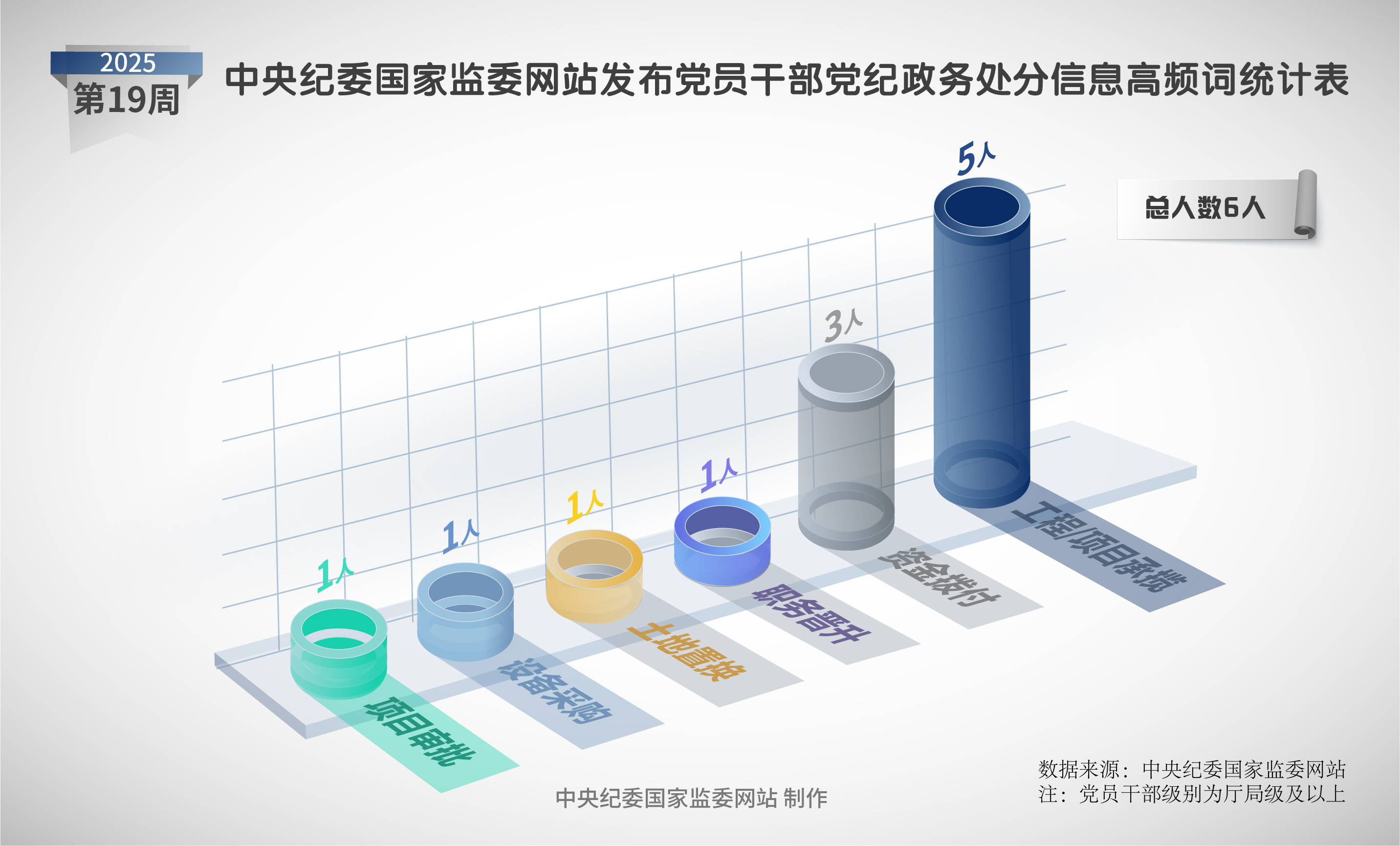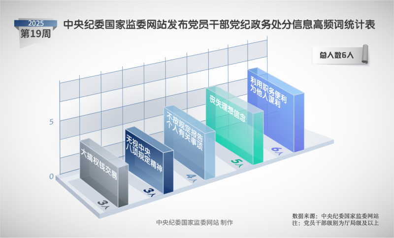 2025年第19周,在中央紀(jì)委國家監(jiān)委網(wǎng)站發(fā)布的6條黨紀(jì)政務(wù)處分通報中,“喪失理想信念”“不按規(guī)定報告?zhèn)人有關(guān)事項”“利用職務(wù)便利為他人謀利”“無視中央八項規(guī)定精神”“大搞權(quán)錢交易”是高頻詞。