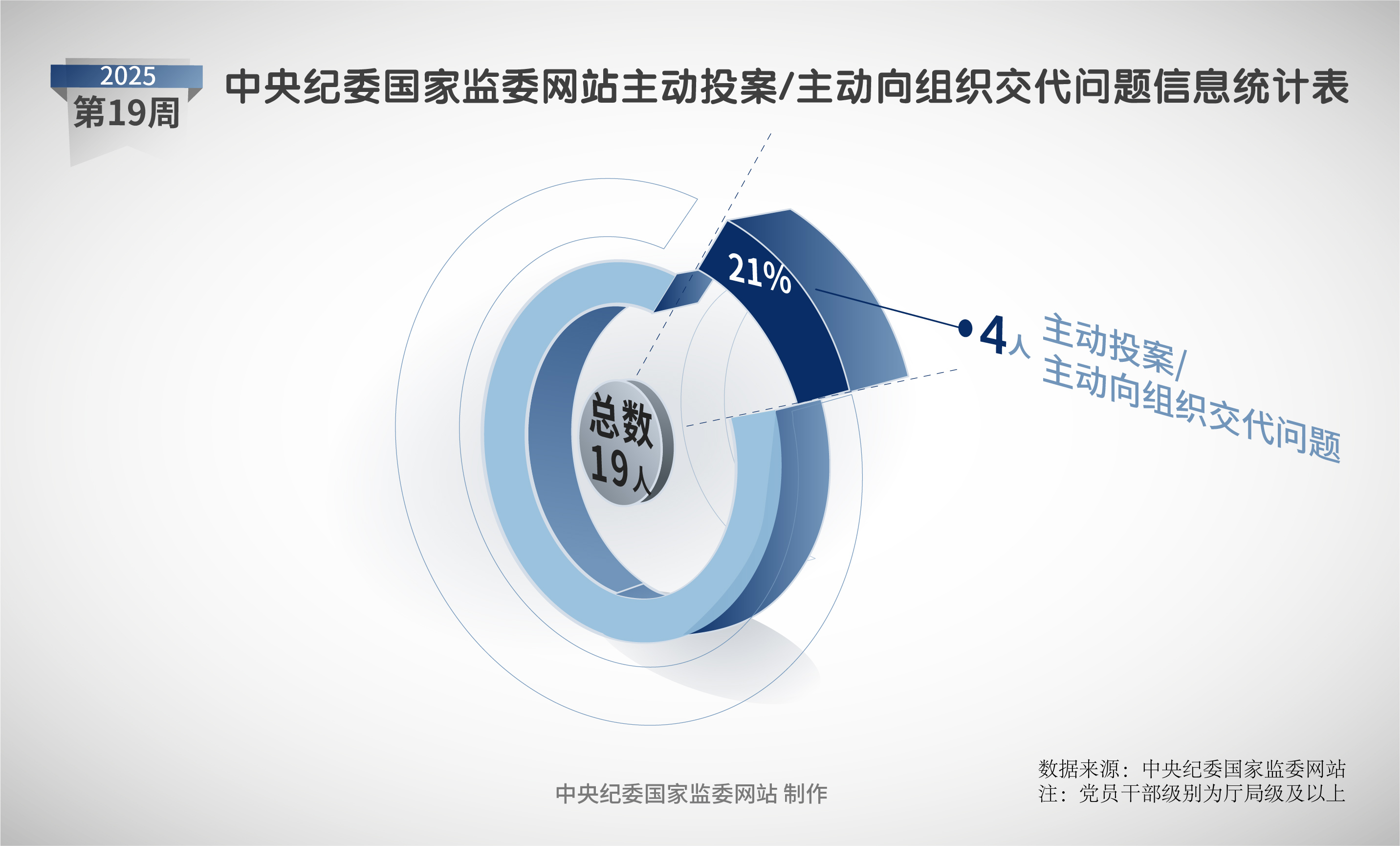 2025年第19周,中央紀(jì)委國家監(jiān)委網(wǎng)站發(fā)布的審查調(diào)查信息中,3名黨員領(lǐng)導(dǎo)干部主動投案,1名黨員干部主動向組織交代問題。